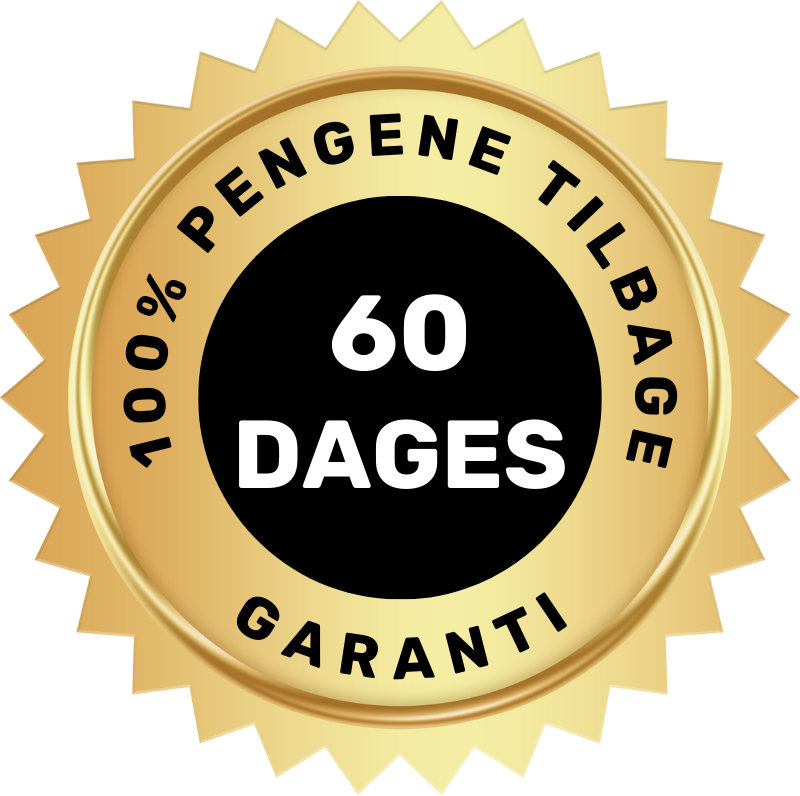 Vi er så sikre på, at du vil få gavn af vores produkt, at vi tilbyder 60 dages pengene tilbage garanti. Hvis du ikke oplever en forbedring, får du hele beløbet retur uden spørgsmål.